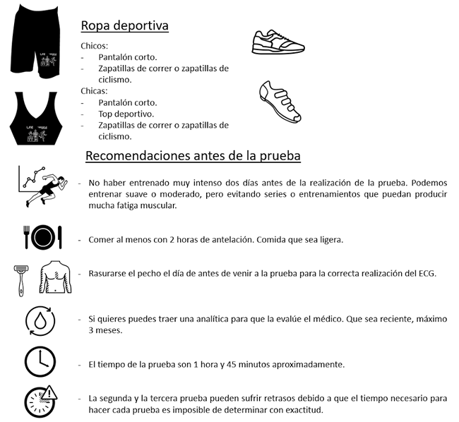 - Las pruebas en cicloergómetro (bici): No se pueden poner pedales LOOK que necesiten llave Allen, SOLO pedales que puedan quitarse y ponerse con llave inglesa del 15.
